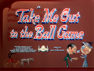 A truly wonderful example of the powers of a well designed and executed matte shot - also from "TAKE ME OUT TO THE BALL GAME" this is a terrific demonstration of a simulated crowd and bleachers of a baseball pavillion.  We are fortunate here in that the original painting still survives and may be examined in detail.  The orientation is slightly different suggesting that the plate was flopped in the optical printer to aid the narrative.