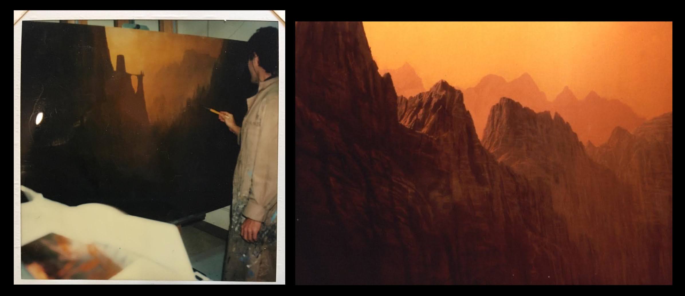 | Mike would split his time on EMPIRE painting mattes and scenic backings such as this, for use with the jaw dropping miniature stop motion sequences. |